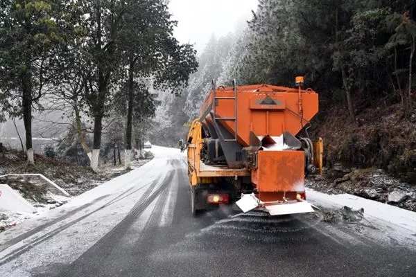 融雪撒布機正在進行撒鹽融雪作業(yè)