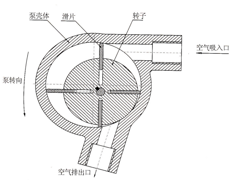 刮片泵主要由泵體、轉子、刮片、端蓋、彈簧等組成。在刮片泵的腔內偏心地安裝一個轉子,轉子外圓與泵腔內表面相切(二者有很小的間隙),轉子槽內裝有帶彈簧的二個刮片。旋轉時,靠離心力和彈簧的張力使刮片頂端與泵腔的內壁保持接觸,轉子旋轉帶動刮片沿泵腔內壁滑動。