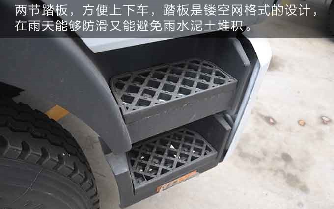 首先,進(jìn)入視線的是東風(fēng)多利卡D9吸污車駕駛室的兩節(jié)踏板,因?yàn)檫@款吸污車的底盤比較高,為了方便上下車,所以設(shè)計(jì)了兩節(jié)踏板,且踏板是鏤空網(wǎng)格式的設(shè)計(jì),在雨天能夠防滑又能避免雨水泥土堆積。