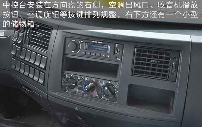中控臺(tái)安裝在方向盤的右側(cè),空調(diào)出風(fēng)口、收音機(jī)播放按鈕、空調(diào)旋鈕等按鍵排列規(guī)整,右下方還有一個(gè)小型的儲(chǔ)物箱。