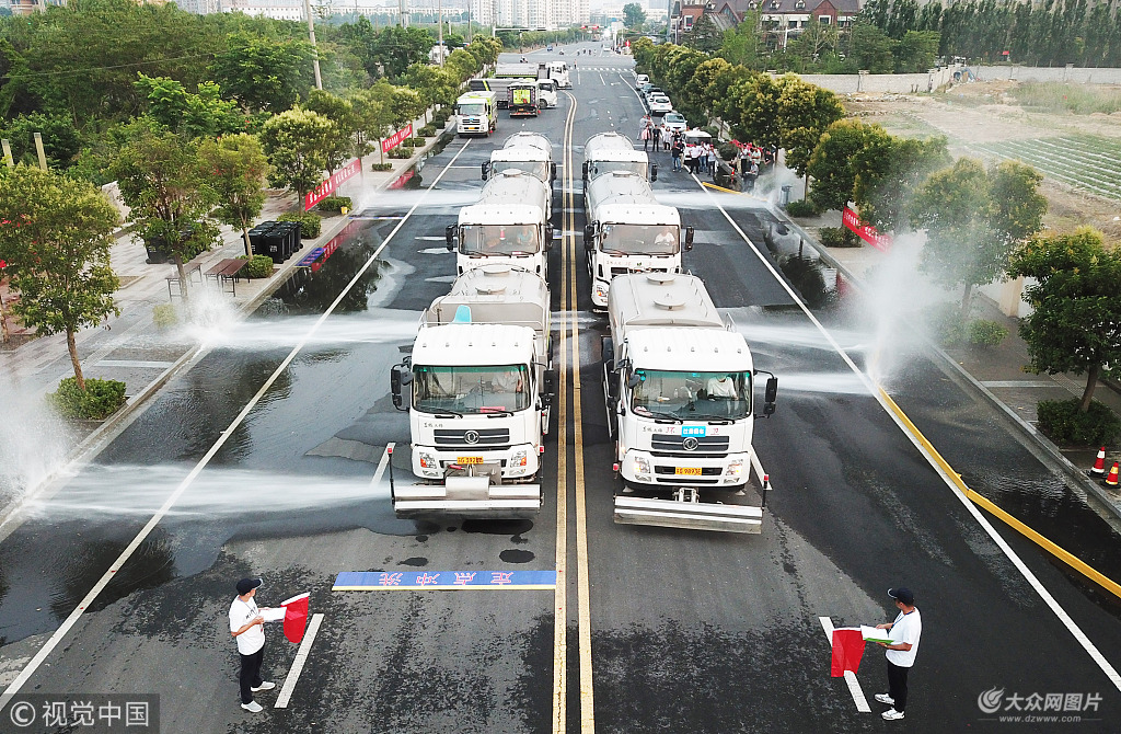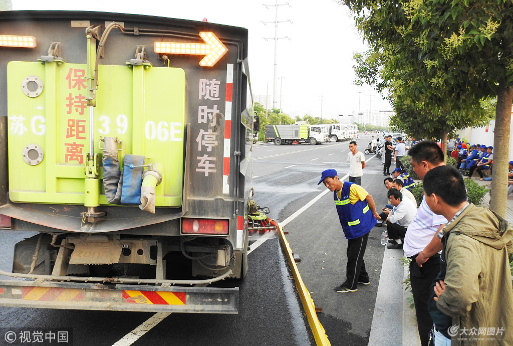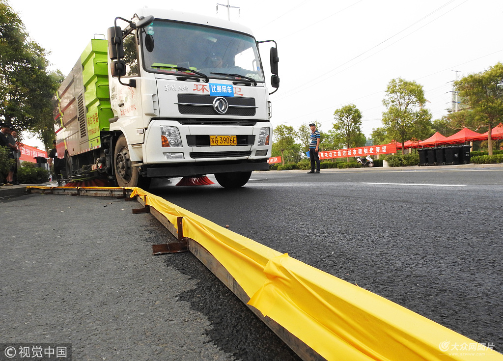 當(dāng)日,江蘇連云港市海州區(qū)舉辦首屆環(huán)衛(wèi)工人技能展示活動(dòng),50多名“城市美容師”分別在道路機(jī)械化沖洗、機(jī)械化清掃、電動(dòng)垃圾車(chē)收集、壓縮垃圾車(chē)收集、慢車(chē)道清掃、人工清掃等6個(gè)作業(yè)項(xiàng)目上秀出絕活,展示標(biāo)準(zhǔn)化、精細(xì)化環(huán)衛(wèi)作業(yè)方式。2018年6月8日,江蘇連云港,環(huán)衛(wèi)工人在展示道路機(jī)械化沖洗技能。圖片作者:耿玉和/視覺(jué)中國(guó)