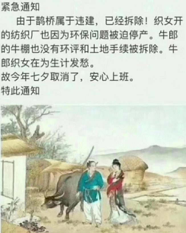 今天是所謂的“中國情人節(jié)”,農歷七月初七,是七夕節(jié),又名乞巧節(jié)、七巧節(jié)、雙七、香日、星期、蘭夜、女兒節(jié) [1] 或七姐誕等。 “七夕”最早來源于人們對自然天象的崇拜。早在《詩經(jīng)》時代,人們就對牛郎織女的天象有所認識,在東漢時就出現(xiàn)了人格化的描寫:“織女七夕當渡河,使鵲為橋?!?