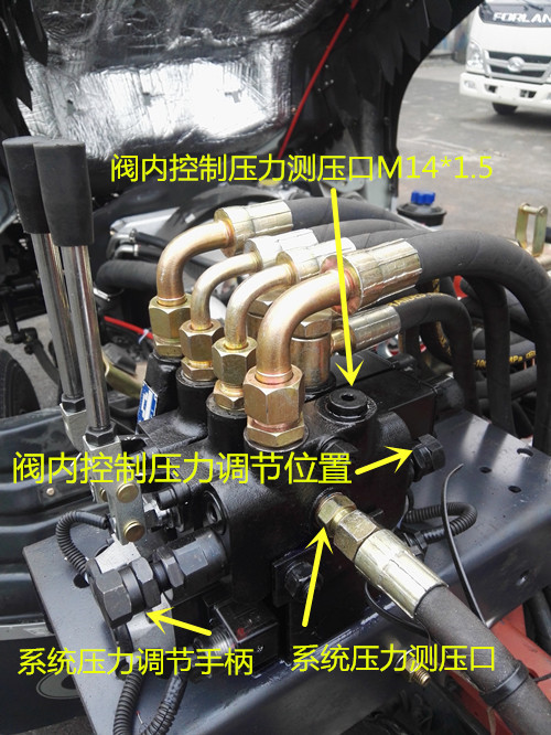 4,操作主臂缸的控制閥操作手柄,讓油缸伸縮幾個回合后,再操作控制閥手柄讓主油缸完全縮回,此時不要松開操作手柄,讓油缸一直處于縮回狀態(tài),此時用22mm叉子搬手調(diào)整調(diào)壓閥的螺壓螺母,順時針調(diào),壓力增大,逆時針調(diào),壓力減小,調(diào)到壓力為12Mpa時,松開控制閥的操作手柄,再逆時針旋轉(zhuǎn)擰緊調(diào)壓閥的鎖緊螺母,到此,調(diào)壓完成。再將主油伸出300-500mm,給調(diào)節(jié)行程開關(guān)留出空間。