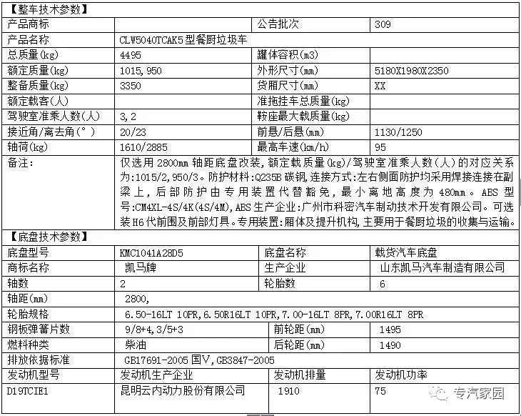凱馬3方餐廚垃圾車整車尺寸5180×1980×2350 ,容積:2.5~3m3,總質(zhì)量:4495Kg,額定質(zhì)量:1015,950kg,整備質(zhì)量:3350kg,軸距:2800,輪胎規(guī)格:6.50R16