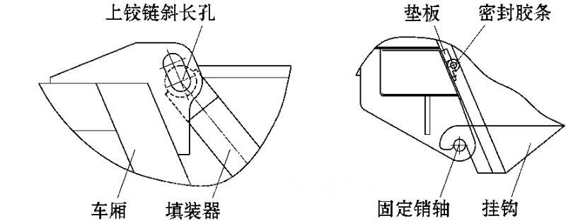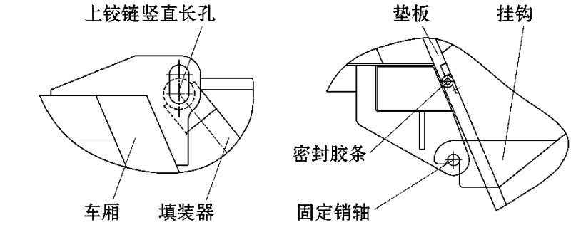 如圖 9 ,車廂和填裝器之間裝有舉升油缸和鎖止機(jī)構(gòu) ,舉升油缸驅(qū)動(dòng)鎖止機(jī)構(gòu)動(dòng)作和填裝器升降。這種自動(dòng)鎖緊方式作用力大 ,使膠條壓縮量大 。車廂與填裝器上部鉸鏈孔為圓孔 ,消除了對(duì)密封膠條的搓、拉、扭、磨等損傷。