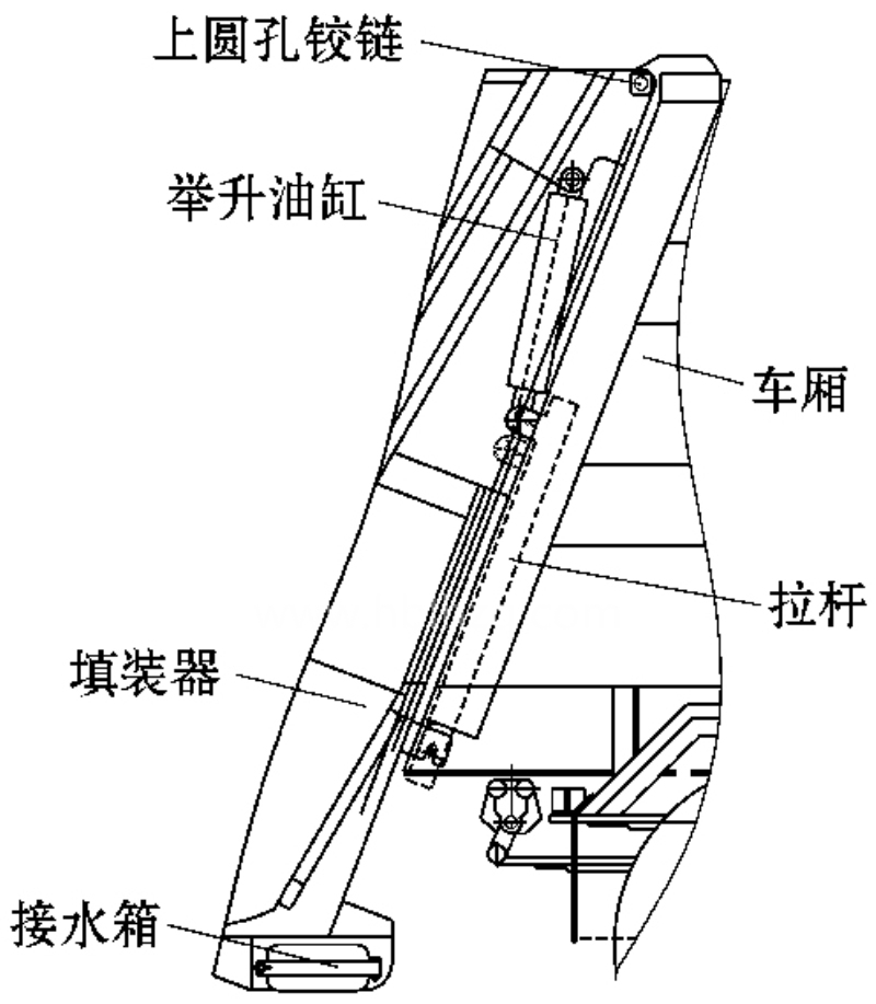 但這種密封方式利用填裝器的重力與掛鉤的拉力共同作用 ,密封作用力小 ,且不具有可調(diào)性。在裝載垃圾作業(yè)過(guò)程中 ,周期性的垃圾膨脹力易使填裝