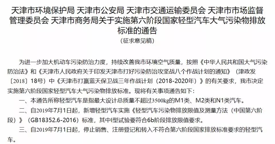 天津:11月28日,天津市環(huán)保局、公安局等多部委聯(lián)合發(fā)布了有關(guān)“國六”政策的《征求意見稿》,意見指出:“國六”排放標(biāo)準(zhǔn)計(jì)劃自2019年7月1日起實(shí)施,但該通告目前仍處于意見征集階段,這意味著天津?qū)嵤皣辈粫?huì)早于2019年7月1日。