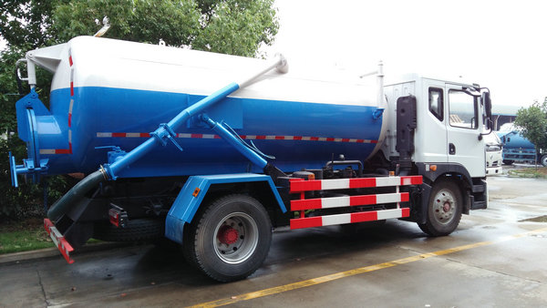 由于東風多利卡D9真空吸污車吸糞膠管始終浸沒于液面上,糞罐內(nèi)的空氣被抽吸后,因其得不到補充而越來越稀薄,致使罐內(nèi)壓力低于大氣壓力,糞液即在大氣壓力使用下,經(jīng)吸糞膠管進入容罐?;蛘哂捎诤缥芙咏薜祝諝獗徊粩嗯湃爰S罐時,因其沒有出路而被壓縮,致使罐內(nèi)壓力高于大氣壓力,糞液即在壓縮空氣的作用下,經(jīng)虹吸管,吸糞膠管排出罐外。