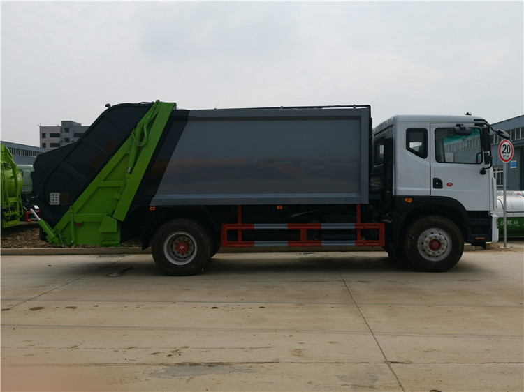 采用武鋼Q345高級(jí)耐磨鋼板一次性沖壓成型制作弧形箱體,邊4mm底5mm,垃圾箱體內(nèi)帶卸料前推板,填裝器帶滑板和垃圾刮板(可有效的將填裝器內(nèi)的垃圾刮入垃圾箱體內(nèi)),垃圾箱體前后帶污水箱(可有效防止污水泄漏,防止二次污染)和手電操作系統(tǒng)(方便操控,一個(gè)即可實(shí)現(xiàn)垃圾的裝載和卸料),駕駛室?guī)LC一鍵操控(可選臺(tái)灣永宏或西門子),定制型液壓油缸(可選海戰(zhàn)力、煙臺(tái)未來、江蘇騰達(dá)或廈門銀華油缸),揚(yáng)州中梅多路閥(可選意大利海德),合肥長(zhǎng)源液壓油泵,垃圾上料裝置為翻轉(zhuǎn)架,可同時(shí)掛2個(gè)240L國(guó)標(biāo)垃圾桶(也可選擇半密封三角斗或全密封斗)