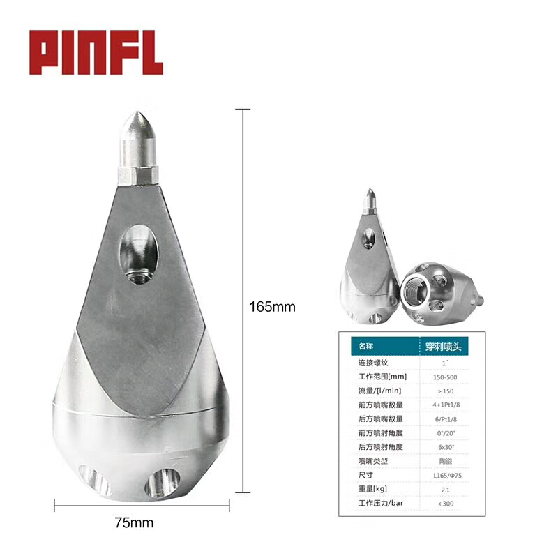 除了直噴頭以外,每個(gè)噴頭都有向后的6個(gè)噴射孔(一邊穿透、破碎、攪拌堵塞物,一邊推動(dòng)噴頭和耐高壓水管前進(jìn)),其中2、3、5、8號(hào)另外,還有一個(gè)前噴孔(穿刺堵塞物并作為導(dǎo)引孔)。