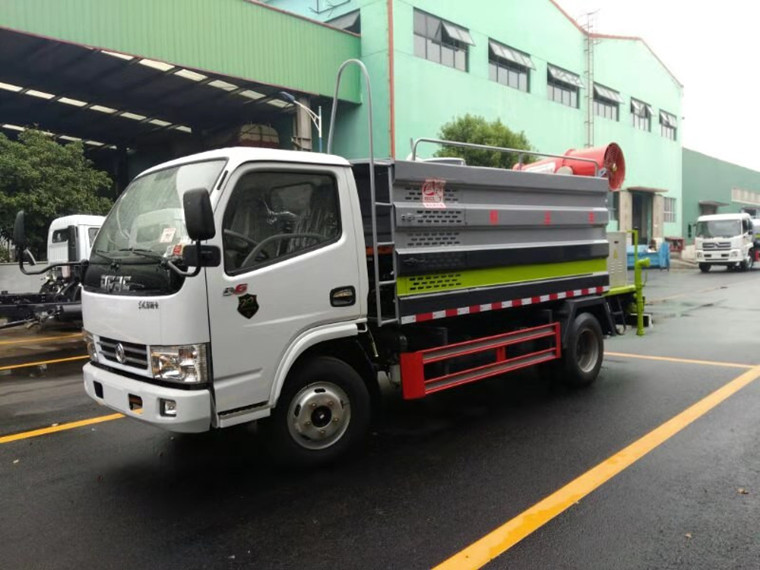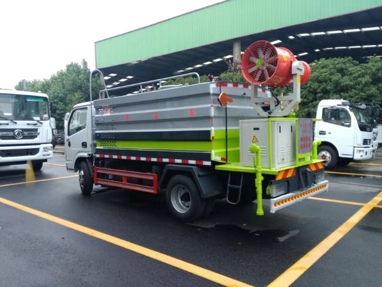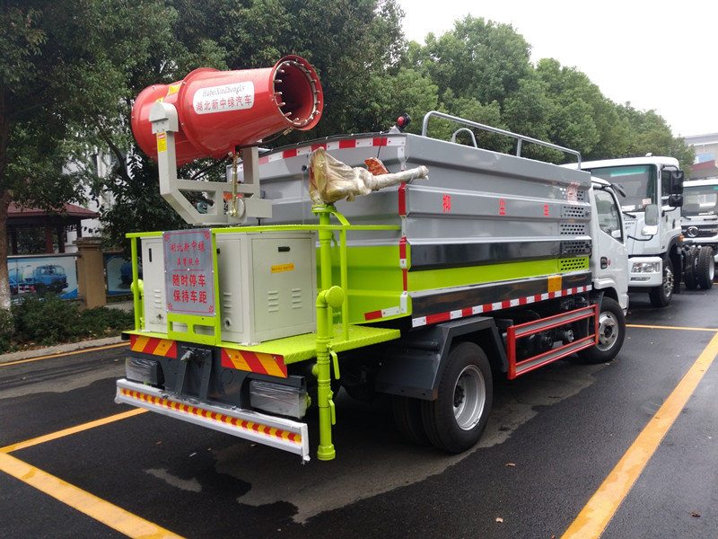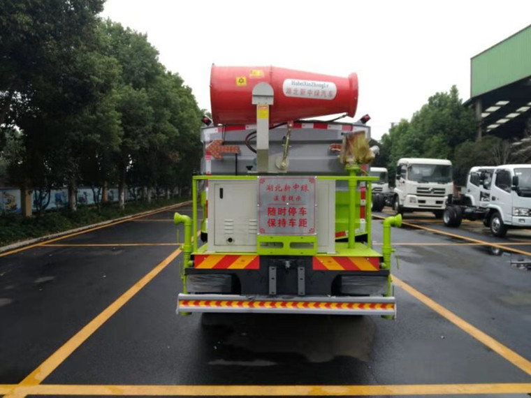 具備灑水車的全套功能,箱體前面裝發(fā)動機,后面平臺上面裝噴霧機。既能灑水又能噴霧,一車多用。