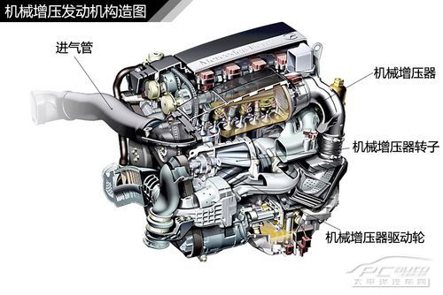 相對于渦輪增壓,機(jī)械增壓(Supercharger)的原理則有所不同。機(jī)械增壓主要是通過曲軸的動力帶動一個機(jī)械式的空氣壓縮機(jī)旋轉(zhuǎn)來壓縮空氣的。與渦輪增壓不同的是,機(jī)械增壓工作過程中會對發(fā)動機(jī)輸出的動力造成一定程度的損耗。
