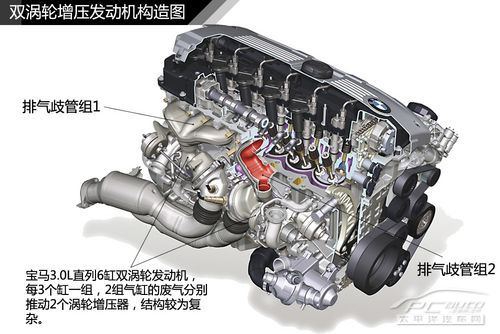 雙增壓發(fā)動機(jī),顧名思義就是指一臺發(fā)動機(jī)上裝有兩個增壓器。如一臺發(fā)動機(jī)上采用兩個渦輪增壓器,則稱為雙渦輪增壓發(fā)動機(jī)。如寶馬3.0L直列六缸發(fā)動機(jī),采用的就是兩個渦輪增壓器。