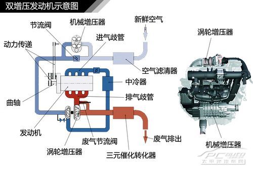 雙增壓發(fā)動機(jī)示意圖(渦輪增壓器+機(jī)械增壓器)