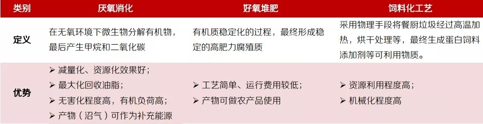 餐廚垃圾的特點包括有機物含量高,含水率高,易腐爛變質(zhì),易發(fā)酵、發(fā)臭,主要是采用厭氧消化、好氧堆肥和飼料化工藝等生物法進(jìn)行處理。其中厭氧消化工藝能最大化回收油脂,無害化程度高,并能夠充分地對餐廚垃圾中的有機物進(jìn)行資源化回收和利用, 已經(jīng)有超過 70%的餐廚垃圾處理項目使用這條技術(shù)路線, 是現(xiàn)階段的主流工藝路線。