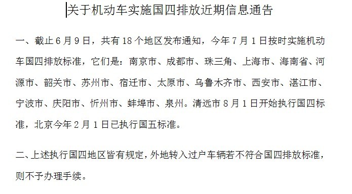 工信部通知7月1日起停止國3車新公告申報,環(huán)保部表態(tài)7.1按期實施,已宣布7.1號按期實施國四(包括注冊,轉(zhuǎn)入)的地方政府有北京、上海、杭州、南京、蚌埠、泉州、廣州、深圳、湛江、清遠、河源、海南、成都、雅安、西安、蘭州、慶陽、烏魯木齊總共18個區(qū)域。