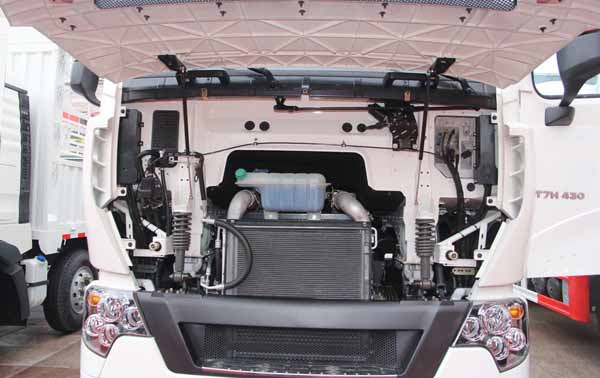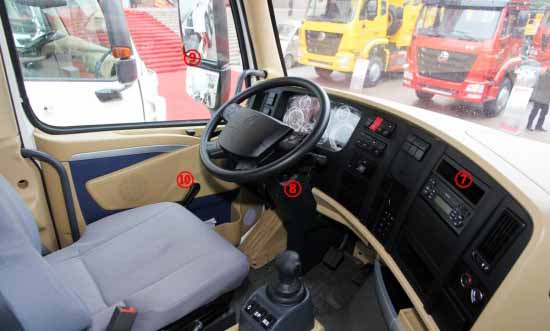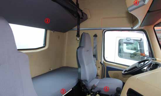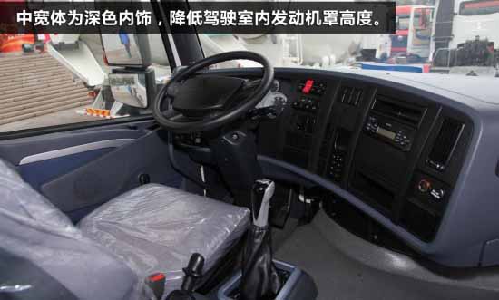 中寬體駕駛室采用了深顏色內(nèi)飾,降低駕駛室內(nèi)發(fā)動(dòng)機(jī)罩高度后,也就不再是平地板駕駛室了,內(nèi)部空間相對(duì)減小,駕駛室高度也有降低,不過(guò)這么做最直接的作用就是自重相比寬體駕駛室減重150kg。