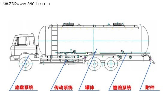粉粒物料運輸車主要由底盤與上裝部分組成,簡單可以分為:底盤系統(tǒng)、傳動系統(tǒng)、罐體、管路系統(tǒng)、附件等五大部分組成。