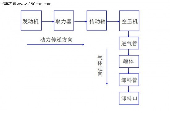 汽車發(fā)動機(或外置電機)的動力經(jīng)取力器、傳動軸等傳動裝置傳遞給空氣壓縮機,由空壓機產(chǎn)生的壓縮空氣(或外接的壓縮空氣)進入罐體內(nèi),經(jīng)過流化裝置把粉粒物料流化,因罐內(nèi)外產(chǎn)生的壓力差,粉粒物料隨空氣一起沿卸料管路輸送到罐外的儲料容器中。
