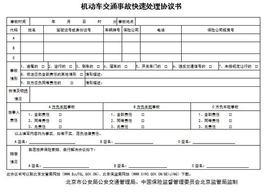 無責(zé)方無損失或損失輕微,不要求賠償,也應(yīng)向其保險(xiǎn)公司報(bào)案,并填寫《機(jī)動(dòng)車交通事故快速處理協(xié)議書》。