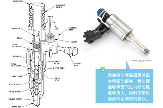噴油器應(yīng)當(dāng)能夠承受氣缸內(nèi)部的溫度和壓力,同時使噴出的燃油呈細(xì)密的霧狀。霧化的效果也取決于柴油機(jī)的噴油嘴。使氣缸內(nèi)部循環(huán)的油霧能夠均勻分布也是一個問題,因此一些柴油機(jī)采用特殊的感應(yīng)閥、預(yù)燃燒腔或其他裝置,以使氣流在燃燒腔內(nèi)呈旋渦狀,或者改進(jìn)點(diǎn)火和燃燒過程。