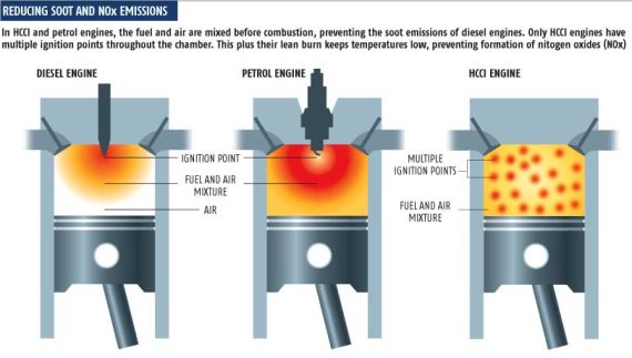 答案當(dāng)然是NO,HCCI發(fā)動機(jī)這一種不倫不類的產(chǎn)物真的很奇怪,HCCI發(fā)動機(jī)使用汽油燃料,但是則使用壓燃的方式點(diǎn)火,通過活塞壓縮混合氣使之溫度升高至一定程度時自行燃燒。