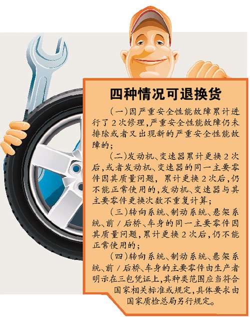 退換貨條件問題,“三包”新規(guī)中列出四種具體情形:(一)因嚴重安全性能故障累計進行了2次修理,嚴重安全性能故障仍未排除或者又出現(xiàn)新的嚴重安全性能故障的;(二)發(fā)動機、變速器累計更換2次后,或者發(fā)動機、變速器的同一主要零件因其質(zhì)量問題,累計更換2次后,仍不能正常使用的,發(fā)動機、變速器與其主要零件更換次數(shù)不重復(fù)計算;(三)轉(zhuǎn)向系統(tǒng)、制動系統(tǒng)、懸架系統(tǒng)、前/后橋、車身的同一主要零件因其質(zhì)量問題,累計更換2次后,仍不能正常使用的;(四)轉(zhuǎn)向系統(tǒng)、制動系統(tǒng)、懸架系統(tǒng)、前/后橋、車身的主要零件由生產(chǎn)者明示在三包憑證上,其種類范圍應(yīng)當(dāng)符合國家相關(guān)標準或規(guī)定,具體要求由國家質(zhì)檢總局另行規(guī)定。